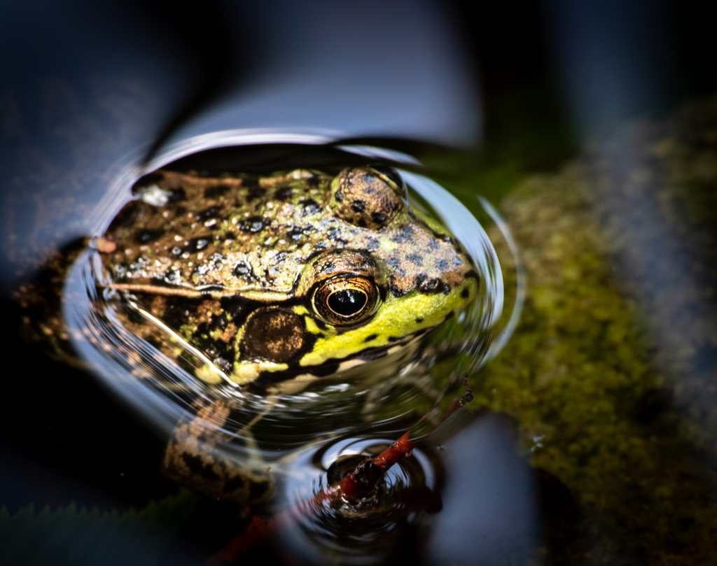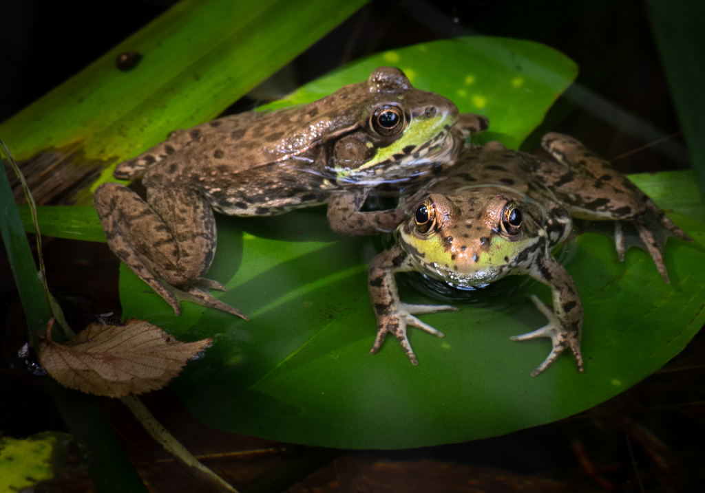 I think the two frogs have weighted down that side of the lily pad so it has sunk into the water a bit. |