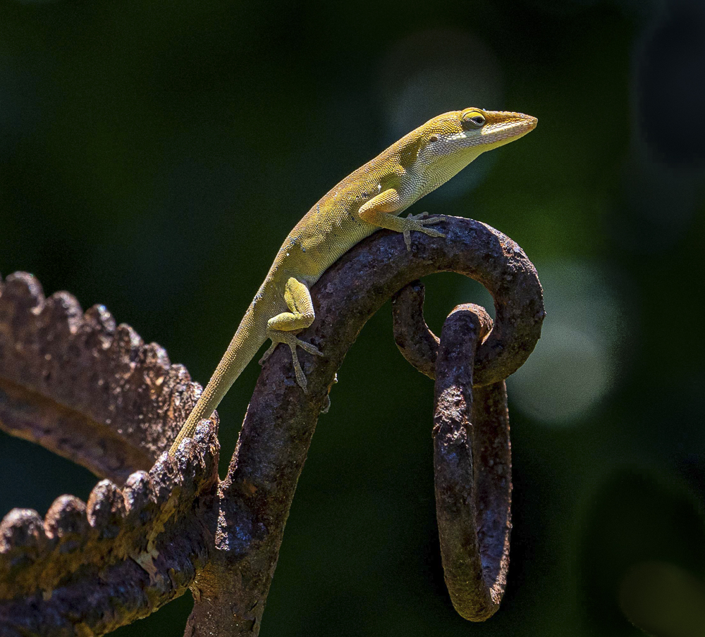 Welcome to this nature group. The texture of the Anole is sharp; I don't think using a faster shutter speed would have made any difference since the Anole was stationary. I agree with Marvyn that the lower right is too bright and distracting - that area could be darkened a bit or cropped out. I think it could be a more compelling image if you cropped in on your subject. See attached possible crop and I darkened some of the bright spots. |