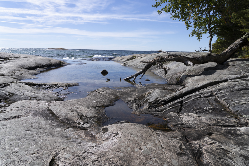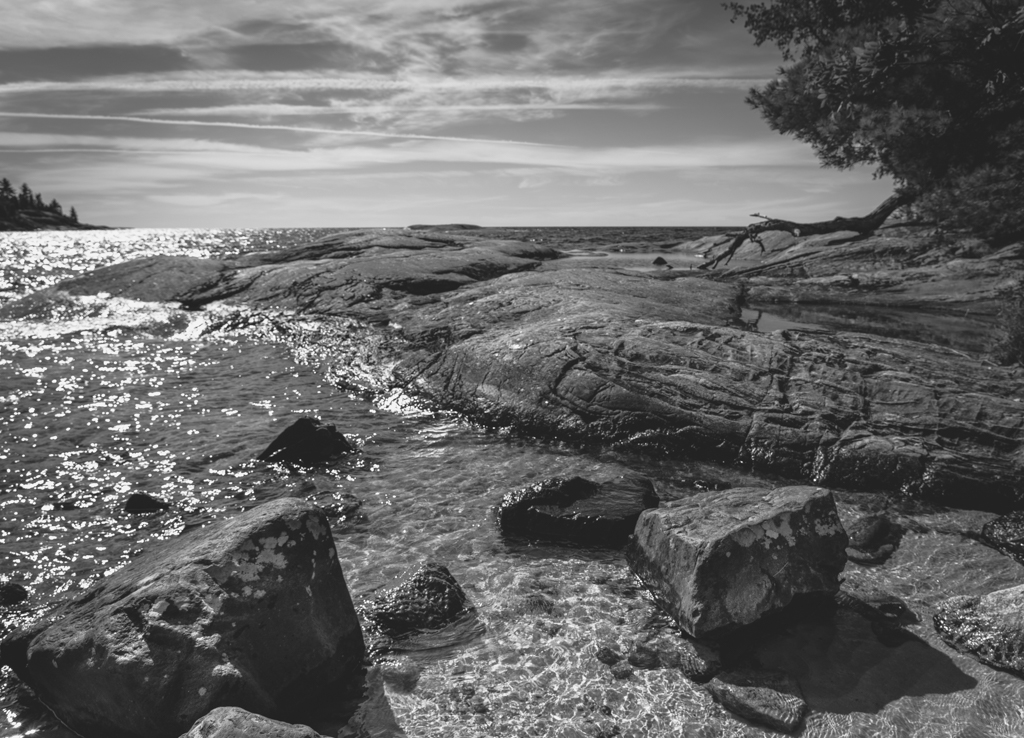 Nice image. With water reflections it often works out that having the horizon near the middle works well. The foreground is detailed and interesting- I might make it slightly lighter. What was your location along the big lake?