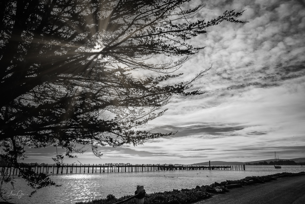 I agree that this is a good image for b/w. As is usually the case, the direct sun tends to visually overpower the other parts of an image. In this case it puts a blown out hole in the tree. I messed around with your image a bit - added some cloned branched, added a bit of sunburst, darkened the light areas in the tree around the sun) but I am not sure it is much of an improvement; maybe a bit better? |
