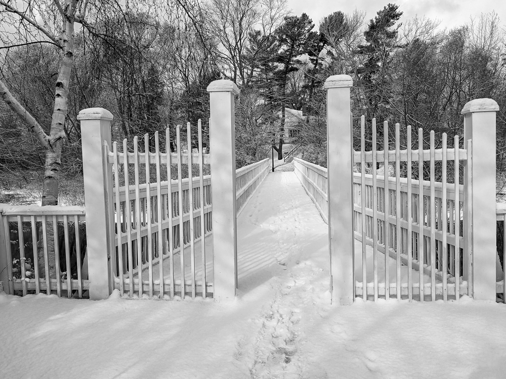 Damon wanted me to add some information regarding "how I made this" so I'll try. Please forgive the length of this posting. At this point in my photographic development I think I often work on a subconscious and intuitive level rather than trying to overtly follow a set of rules or guidelines (which is not to say that I am unaware of such). So I have to work backwards and try to both remember and analytically reconstruct what I did at the time (or maybe I'll just make it up). As noted, I used my phone for this image as I didn't have my camera with me. Since my phone is essentially on "auto" for photographs that simplifies the process (no lens selection or F stop or shutter speed, etc.) and that tends to make me more solely focused on composition. So the challenge with this image became largely one of "where do I place my camera" but before I took any images it was clear to me that this image was meant to be a b/w. There was little color in the original (attached) and the high contrast and soft lighting screamed b/w to me. And I like b/w in general. I do remember moving closer and further from the gate and to the left and right trying to find the best composition. I decided I wanted to include the entire gate and have it largely fill the frame in the foreground. I normally don't take symmetrical images but standing directly in front of the gate gave me the best leading lines and allowed the footprints in the snow to carry off into the distance. I did include a bit of the birch tree to the left of the gate to frame the gate and to prevent total symmetry. Pointing the lens along the walkway allowed the converging horizontal lines and the many perpendicular verticals to be obvious. The darker trees in the background provided the contrast needed for the usual b/w image. The occluded building (the local library) in the background suggested a destination for those footprints in the snow. The only post processing I did was to select one of the b/w image treatments available in Silver Efex Pro. I often do some additional dodging and burning with b/w images but this one didn't require any. |