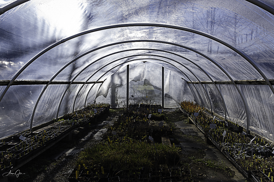 The hoops and the translucent plastic provide an interesting enclosed frame for the viewer's eye with the trees in the background. The foreground isn't of particular interest, at least to me, so a possible edit might place less emphasis on the foreground and more on the hoops and plastic and trees (see attached, for example). |