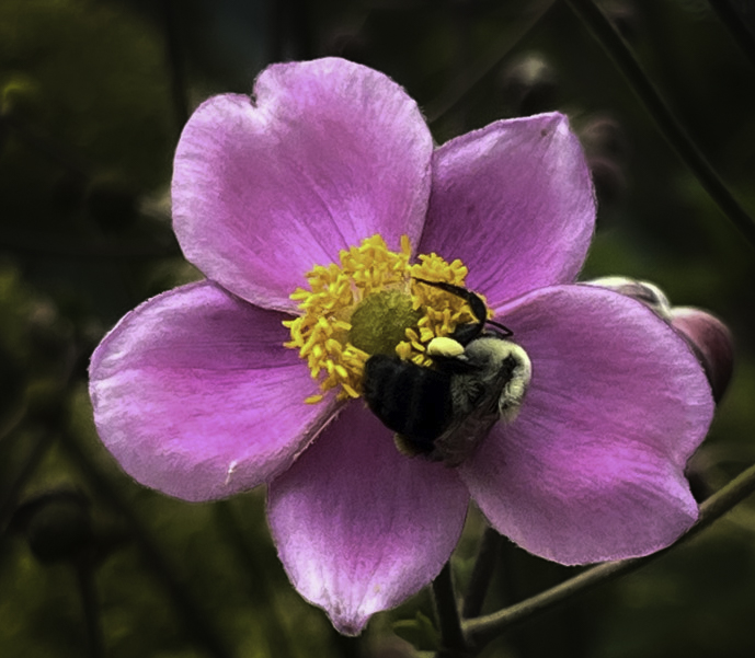 Good capture of the bee and the flower. The background is too bright and distracting with all the dark crossing lines. I might crop in and darken and soften the background. See attached. |
