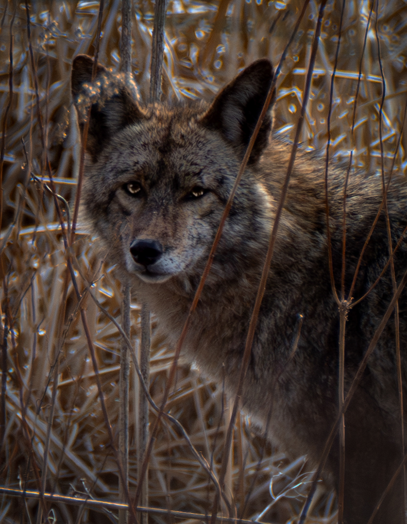 It isn't often that one even sees a cayote more less gets a good image like this. The crop is well selected. I like that you were about to get the face unobscured by the grass but that animal was still within in it. I would brighten the entire image, maybe then add a vignette, and also lighten the face a bit. |