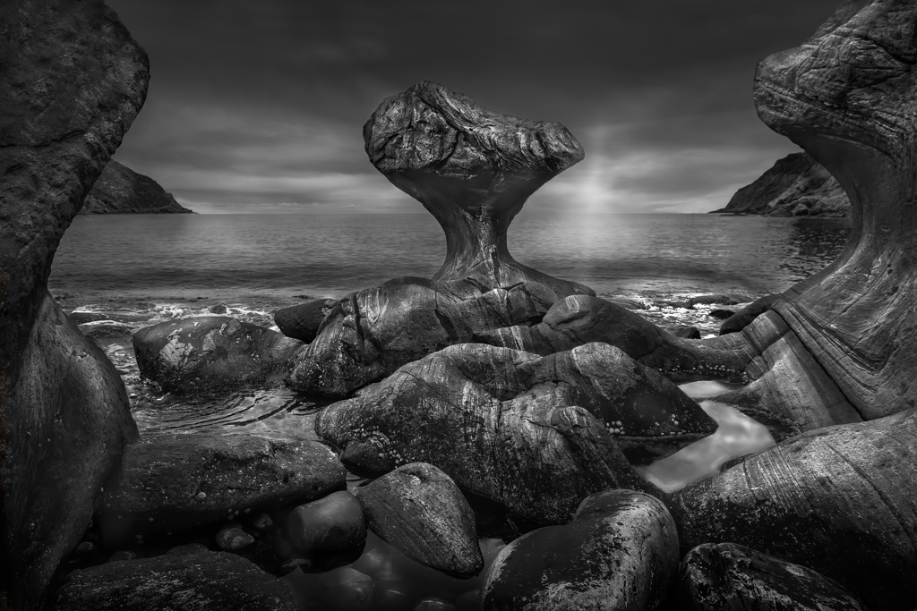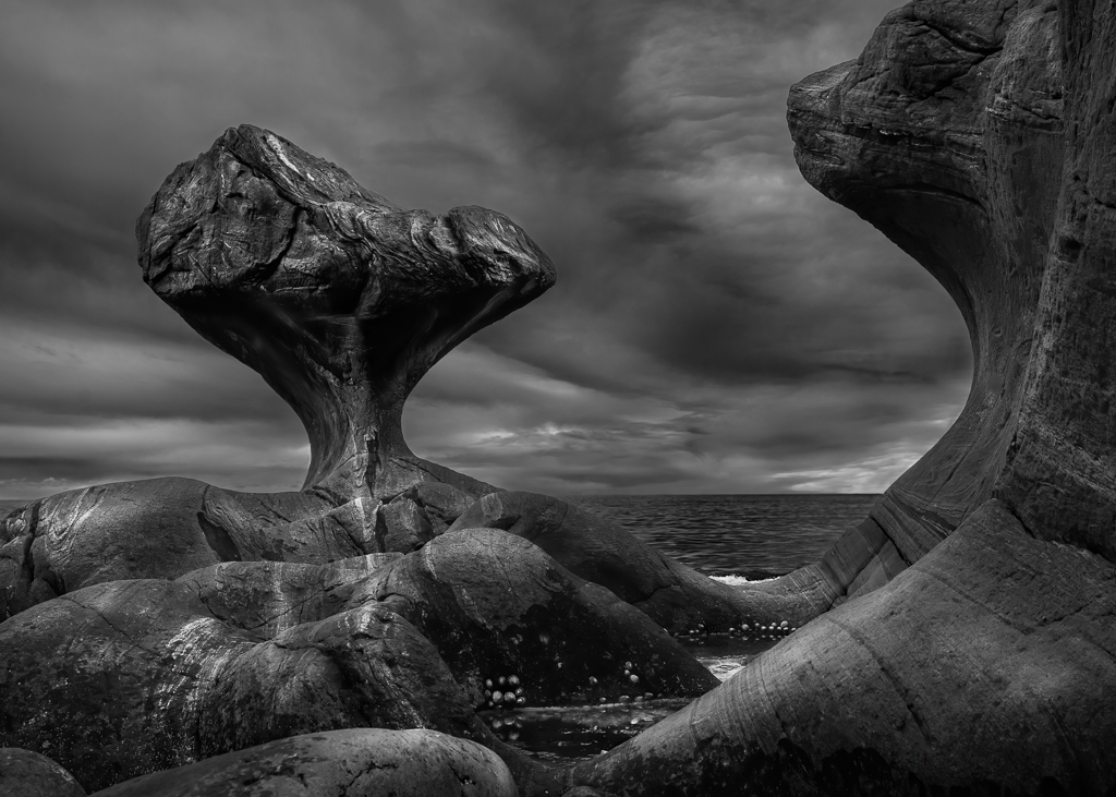 An interesting scene with, what I think are salt formations in the foreground and the blue sea behind. I like the gradient of blue going from very light to dark blue at the top. Also thank you for the education of photographing in such environments. |