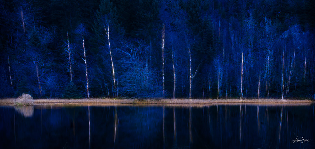 As always, you wait until the right time. The sun is in a perfect position to illuminate the scene and at the same time not dominate. The reflection of the trees just hit the shore plants which to me, enhances the composition. My only suggestion is to crop from the top below the upper light layer of clouds, but I am not 100% sure. |