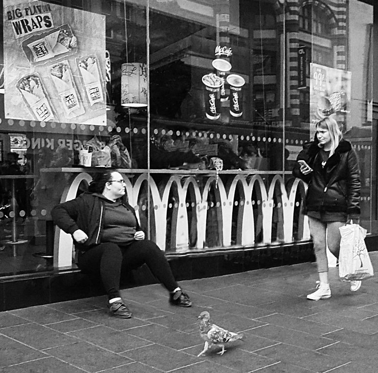 Yes, the softness is a disappointment, I tried to improve it but got little improvement, you can't really add genuine sharpness. Hopefully my new M1 camera will make this mistake less often then the M5 it replaces. The white spots look like reflections or lights inside the shop. Easy to remove, but that would be treating it as a pictorial photograph, which it is not. I sometimes think that the byes given to street photography by those interested in the genre are a bit of a cop out (ie to ignore [to a point] exposure, sharpness, distractions, composition, etc) as without at least some of them the impact of the image could be lost. But here I'd like to claim some of them - the interaction between the women with that background is what I was trying to capture, and the pigeon is..... - I'm not sure what it is, but I like it! |