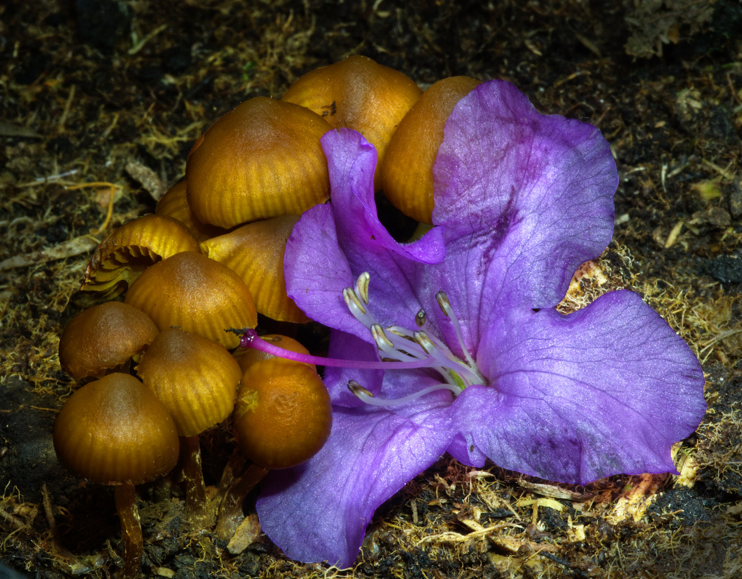 Hi Marti, thanks for your comments. The rhododendron was shedding a few blooms due to being handled, I just moved one next to the fungi, not an original thought!