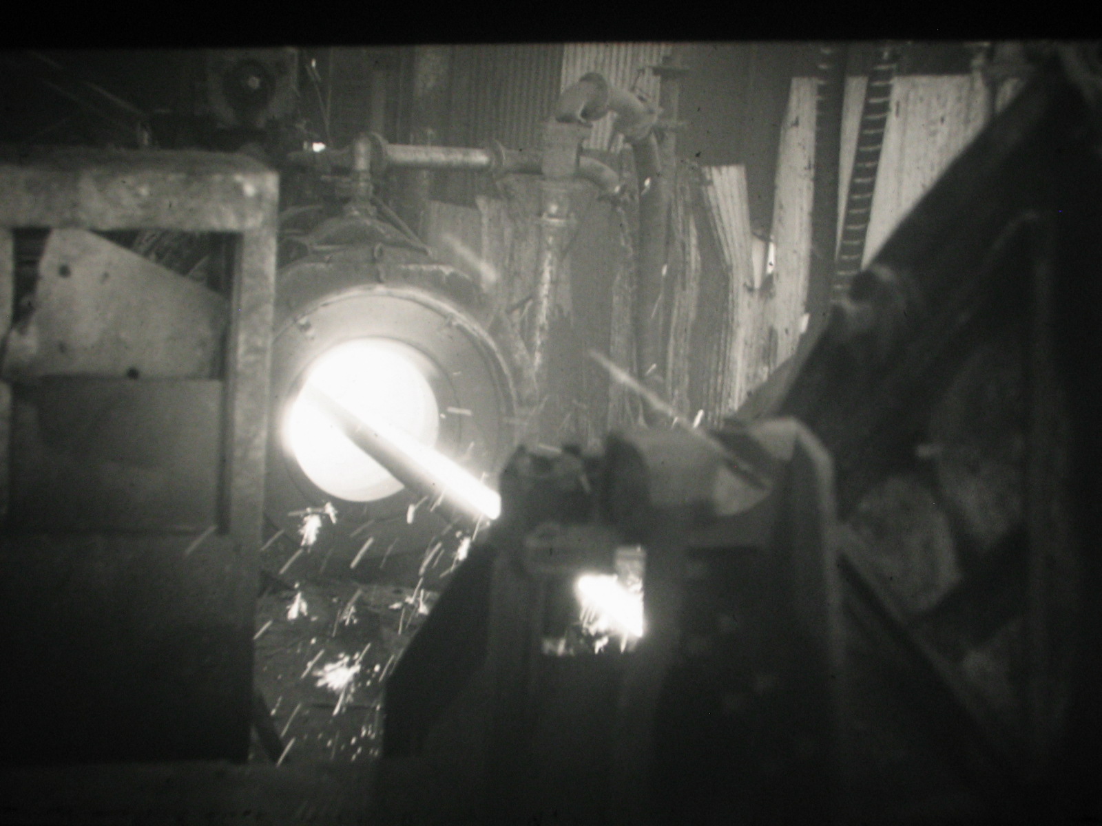 Here's a pipe being pulled out of the back of the casting machine, solid now having been cooled by water jackets in the machine, but still red-white hot |