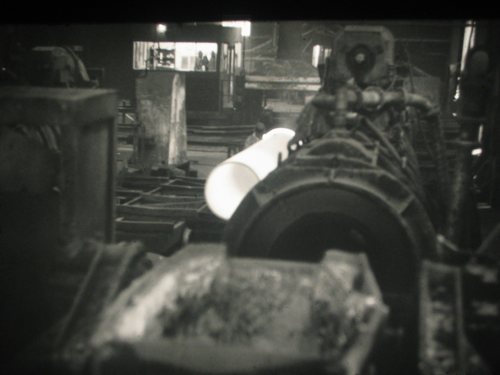 Since people are interested, here's another picture of the casting process. You can see the ladle on the left, the finger-like trough carrying the molten cast iron diagonally in the centre, and the spinning casting machine top left. One of the gay's tasks was to skim off any solid cast iron as it went with the molten iron down the trough as it would cause weakness in the product! Only a boiler suit, goggles, gloves and hard hat for protection! |