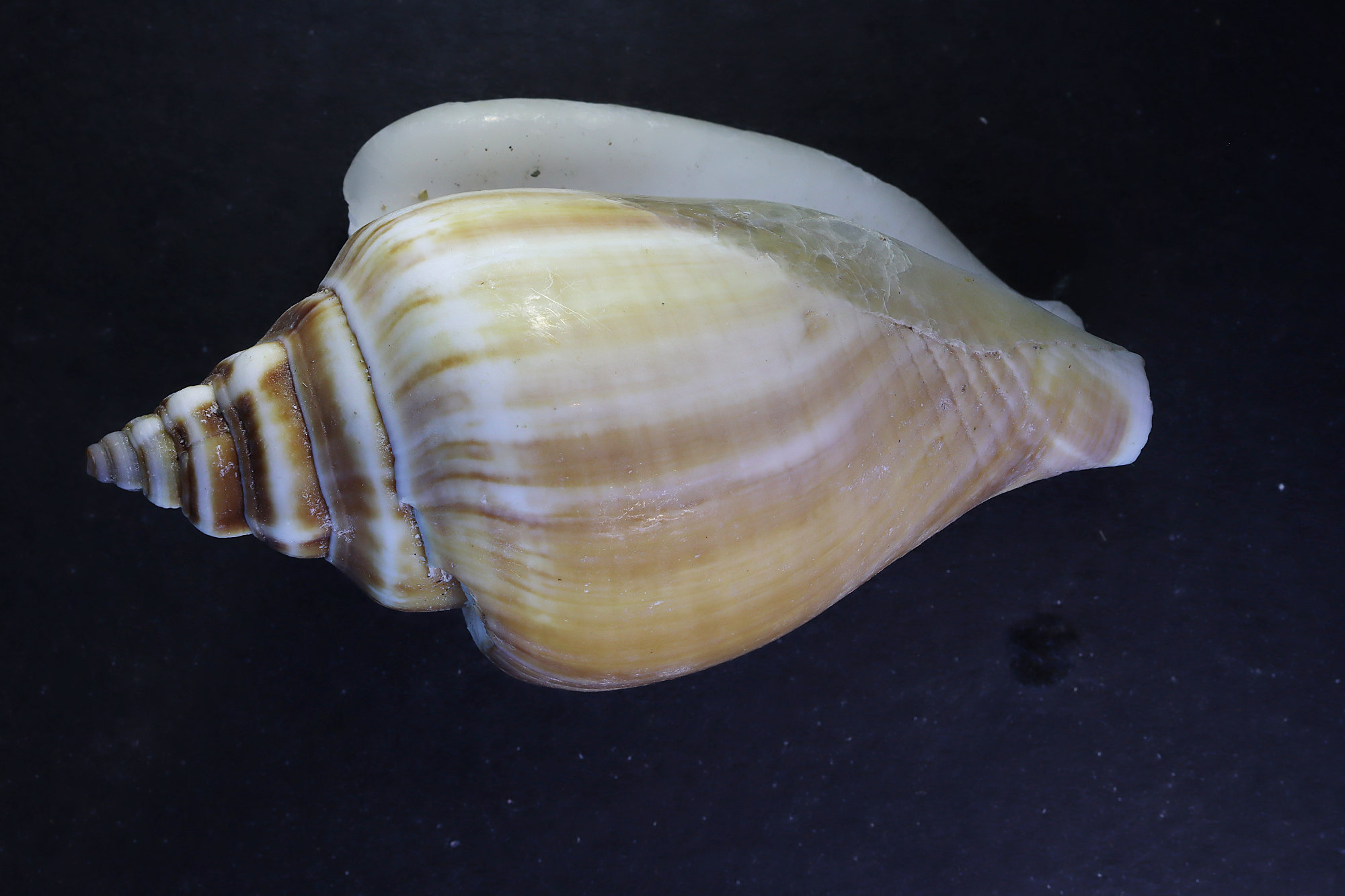 I've taken a quick pic of the whole shell, it's about 2" long from tip to tip. Too deep for one shot, even at f32, so stack of 13 images at f11, 2x Adaptalux lights with diffusers + DIY LED light, Helicon Focus.