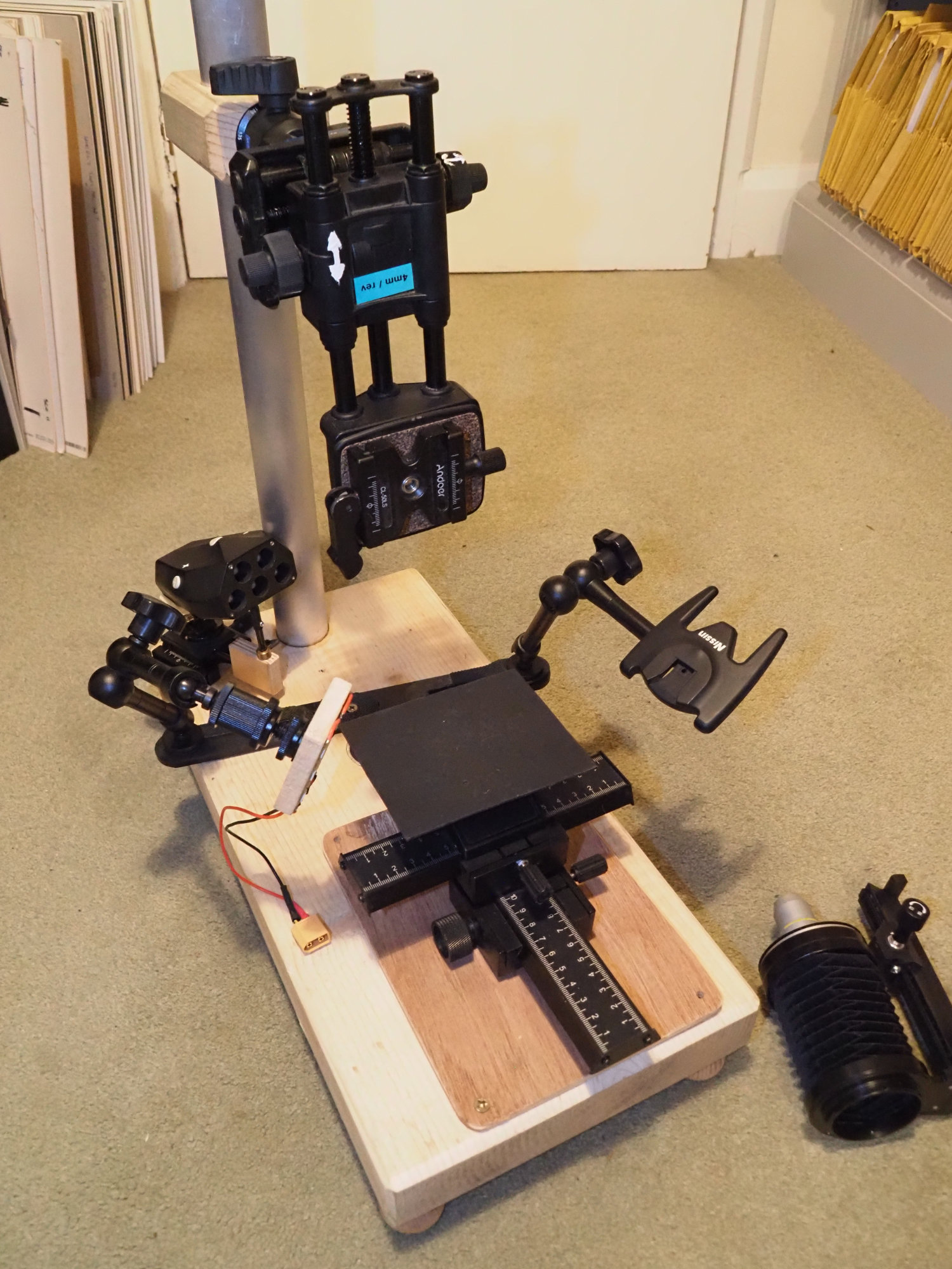 as rigidity isn't important when it's used this way. I use one on my macro rig - the camera only moves up and down, the subject moves on a card platform fastened on the slider. I've put a picture of my indoor macro rig below. You can see the velbon slider for mounting the camera held on a pillar, and on the base a 2-way slider with a card platform on it for the subject, with various lights around it.