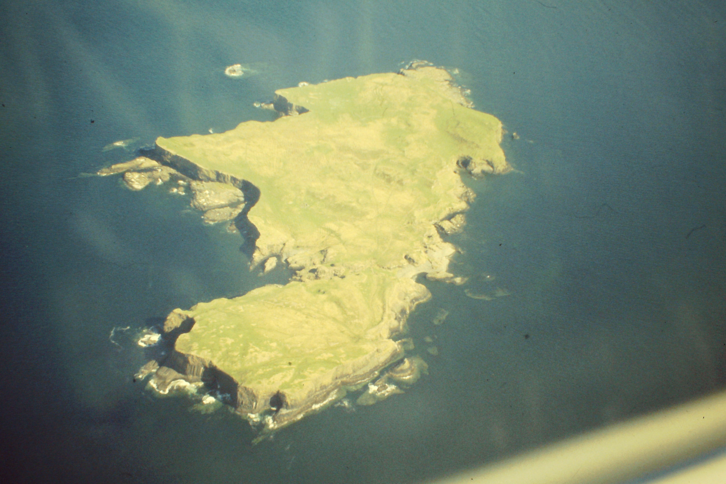For Jerry, here's a picture I took in about 1984, on an Orwochrom slide, from my first light aircraft. This trip was round Scotland and I passed over the island of Staffa. Pretty daft in hindsight in an aircraft powered by a 2-stroke engine to cross water without a raft, but it got me there and back safely. Fingal's Cave is the bottom-most tip in this photo. This is looking more or less north. Further north-east are the islands of Ulva and Mull, then the mainland. Fabulous scenery! |