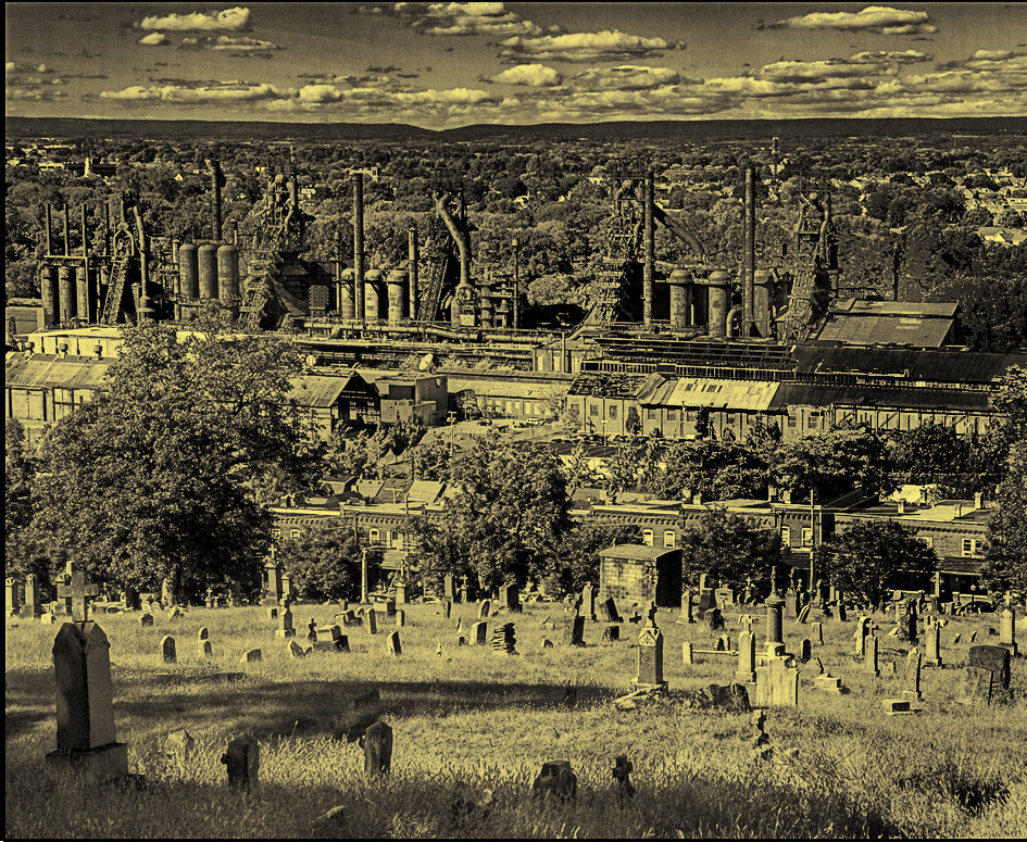 The cemetary in the foreground is great commentary i think. I would prefer to see the shadows less dark, as these are an important part of the story, and I would like the detail there to be more prominent.