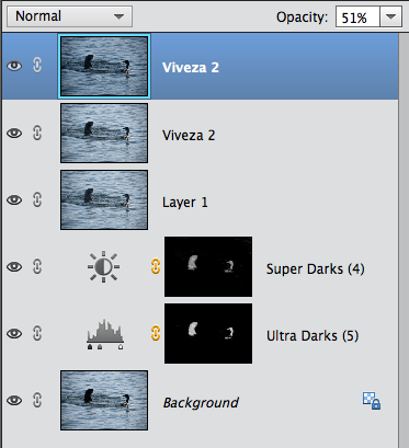 I will try to upload both the image I worked on and a screen shot of the Layers Panel. If I'm successful you will notice that I used Viveza2 twice. I first worked on the animals and then decided to go back and work on the water.