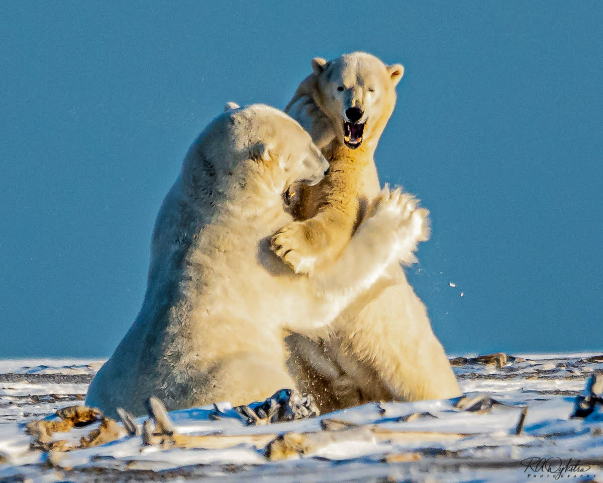 Randy, I tried opening it in Adobe Camera Raw to see if I could bring down the highlights. It seemed to help. I don't know that it improves your original image. It was fun to try. I love their playfulness. I'm glad you were using a telephoto lens. They can be powerful opponents. Nice job. I envy your trip.