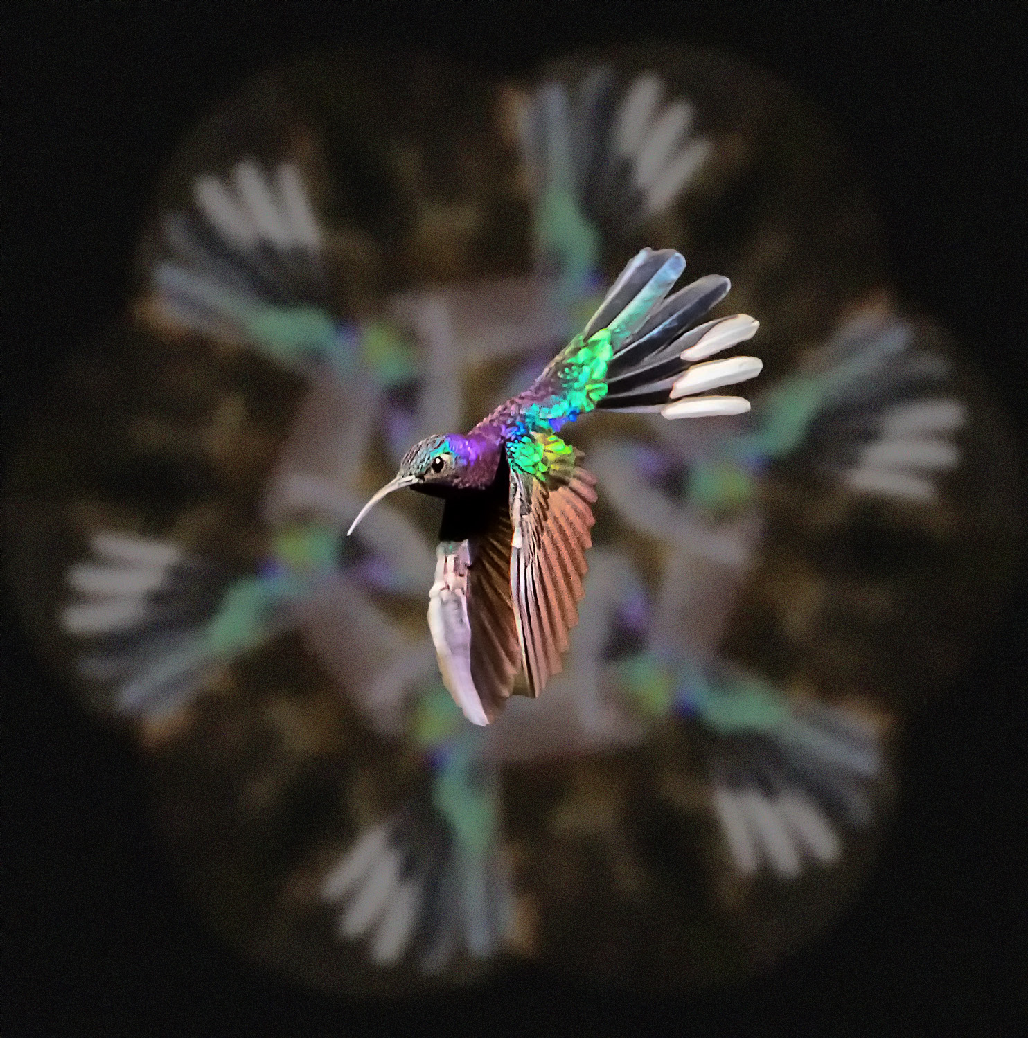 The background was created by using a mandala technique where the image is rotated around 360 degrees. The shutter speed on the hummingbird was 1,000/sec. I'll see if I can bring down the bright spot. |