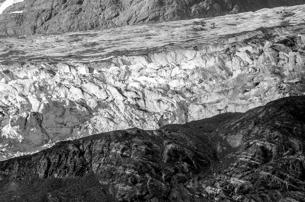 You saw the image well Helen. Thank you. There were a few comments suggesting that I rotate the image. It was the water line that kept me from rotating the image, so I cropped out the water and rotated it. The next question was in which direction do I rotate it? After trying several options I felt that counter clockwise looked best with the glacier surface and the rock striations of the black rock mirroring each other. |