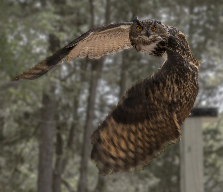 Richard, this is a beautiful "catch". Having the owl look directly at the camera gives the photo a dramatic feeling. I liked the way you cropped the image and the fact that you cloned out the post and light areas (though your cloning shows a few repeating patterns that could be eliminated). I agree that the background is too busy but the blurred wing tips don't bother me at all... they give motion to the photo.