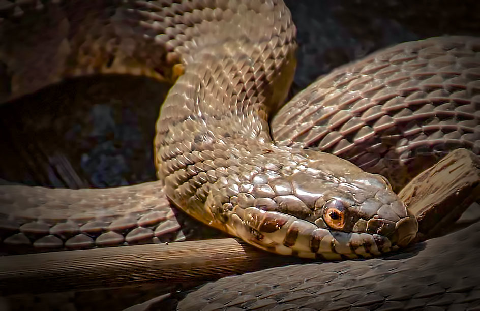 Lisa, it's a fantastic capture. I really like your composition and the vignette really helps focus on the snake's head. I agree with Mike that it might be good to play with the lighting a bit.... so I did. What do you think?