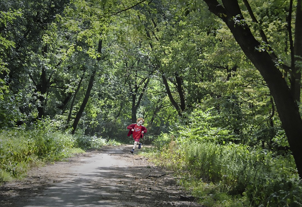 When I saw this image, I felt that it was serene and beautiful. However, finding a point of interest was difficult. Also, after looking at it for a while, I felt that it needed some additional energy. Thus, I found an old picture of my grandson Chris (he's 15 years old now) running along a track. It was a plus that he was wearing red! Thus, I cropped him out of his original picture and inserted him into Tom's lovely photo. I placed him in a darker area of the road so that I wouldn't have to deal with his shadow. Then, observing my work, I felt that the image would benefit from some light manipulation so that Chris would immediately attract the eye of the viewer. Thus, I added a slight vignette and reduced the highlights that were not focused on the boy. Next, I cropped a bit of the left side of the picture. Finally, I wanted to use the dark tree on the right as part of a frame. So, I selected a parallel group of trees on the left and darkened them a bit to provide symmetry. My work was done in Lightroom (actually Camera Raw) and Photoshop. Your thoughts? |