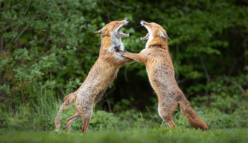 My only suggestion would be to darken the blurred grass in the foreground. The brightness pulls my eyes away from the foxes. Also, possibly a touch of a vignette would further highlight the foxes. I took the liberty of giving it a try. Your thoughts?