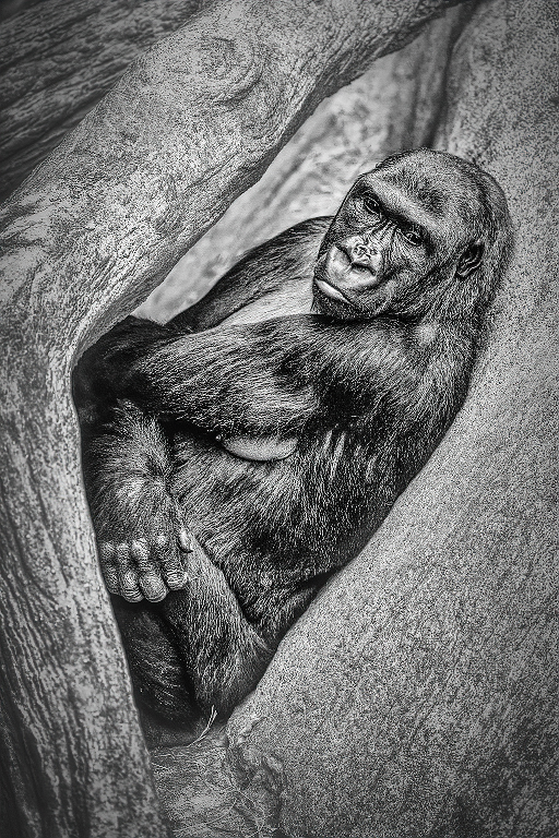 Hattie, I see what you mean. Your post processing resulted in showing the similar texture of the tree and the gorilla. It makes it clear that the tree is the ape's home/environment of preference. I think that approach has significant meaning and value. Nonetheless, I played with the image a bit using Nik's Color Efex Pro 4... specifically the Fog and Blur filters. The control points made it easy to avoid applying the filters to the gorilla. I then lightened the entire image a bit and added just a bit of a vignette. What do you think?