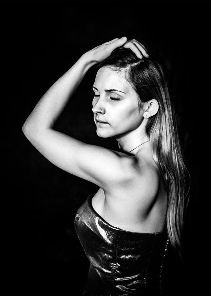 I feel that your image is much stronger as a monochrome. And, I really like your cropping and how you've handled the background and the lower part of her dress. Well done!