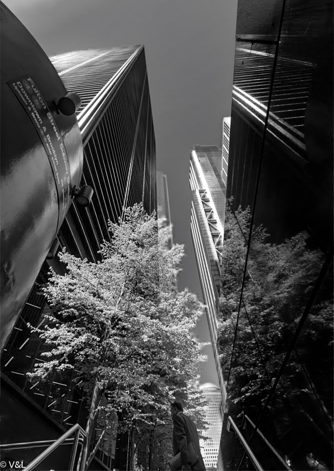 Isreal, I like your image but to me the main subject is the tree and its reflection. The buildings add wonderful context to show how the tree is an anomaly in this area. Toward that end, I played with the color image a bit to emphasize the tree and completely eliminate the man. Then, I converted to B&W.