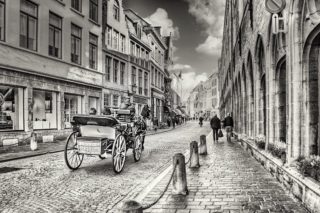 I love playing with images like yours. So, I took the liberty of copying it and using Photoshop, Camera Raw and Nik's Color Efex Pro 4. These let me remove the key-stoning and add a slight tone to fit the mood of "old times". I also did a bit with the light and sharpening in an attempt to have the horse and buggy stand out a bit more. Your thoughts?