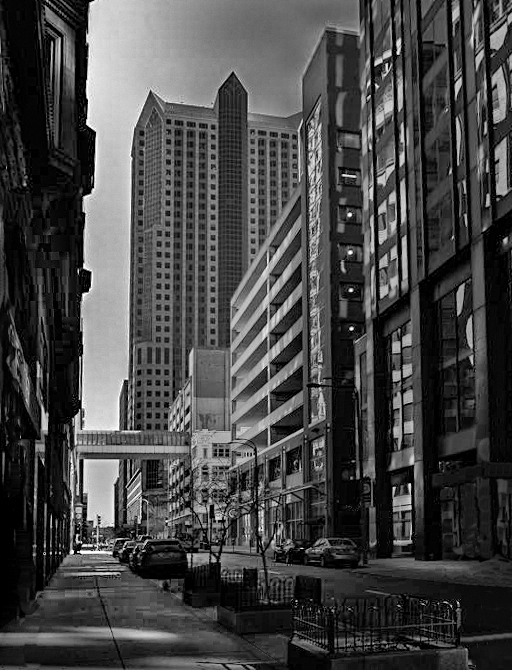 Emil, this is an outstanding photograph to convert to B&W. I love how you dealt with the sky and darkening the street and cars makes lots of sense! Well done.