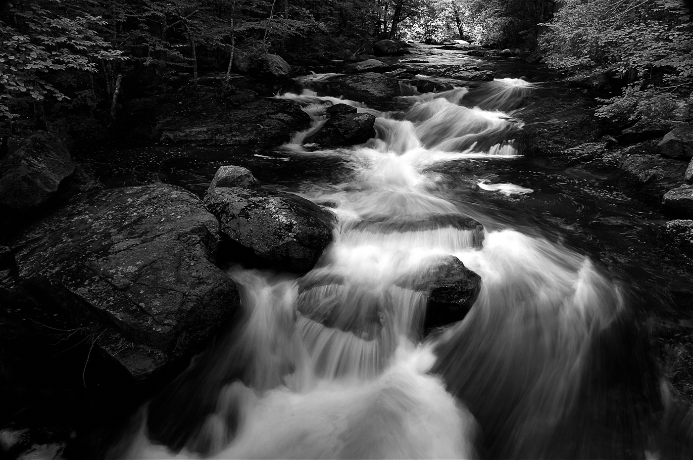I found that the rushing white water led my eyes to the foliage at the top of the stream. With that in mind, I played with your image a bit to further emphasize the bright area at the top. While I was at it, I manipulated the rest of the image a bit to add some detail to the dark rocks and slightly darken the trees on the sides of the stream so they didn't compete with the bright area at the top. Your thoughts?