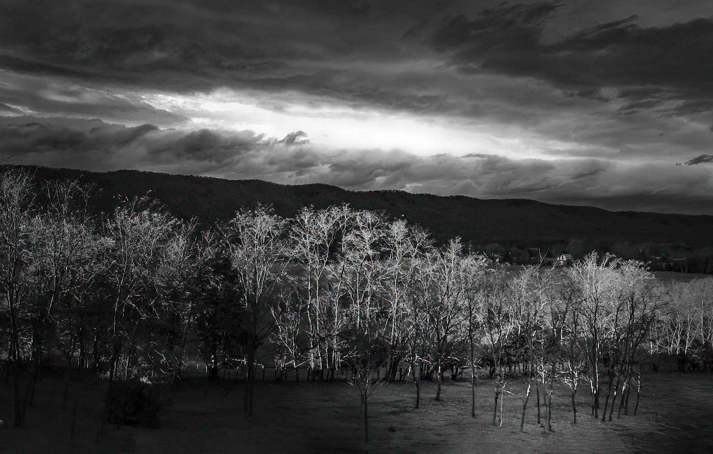 Bob, I really like this image... both in color and B & W. The mountains and clouds following the outline of the trees are wonderful. My eyes are drawn into the entire image.