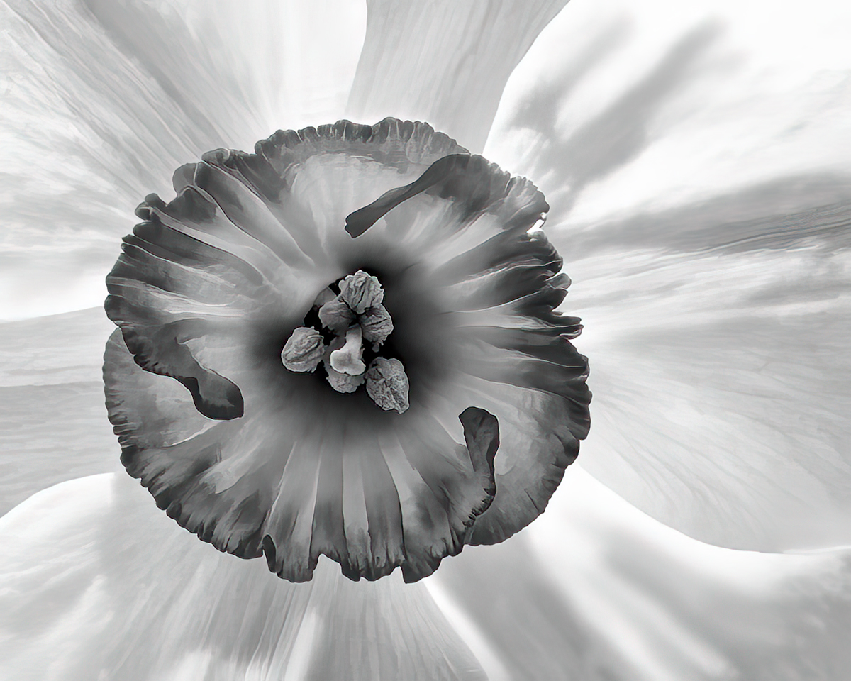 Bunny, I like what you did to the original image! You have turned a nice (but common) flower photograph into a fascinating work of art. It's clear that you want the viewer's eyes to go to the center of the daffodil. So, in keeping with our tradition (lol), I played with your image a bit in photoshop. My goal was to make the center even more prominent. Your thoughts?