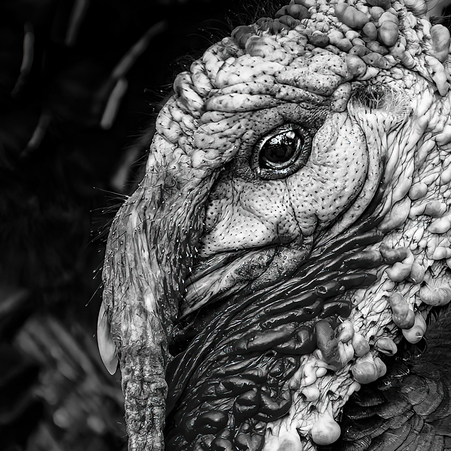Fascinating! I've always thought turkeys were interesting, and your image shows why. All of the bumps and folds are certainly unique to this bird. I like your conversion to B&W and decided to play with some other approaches. My favorite is below. What do you think? |