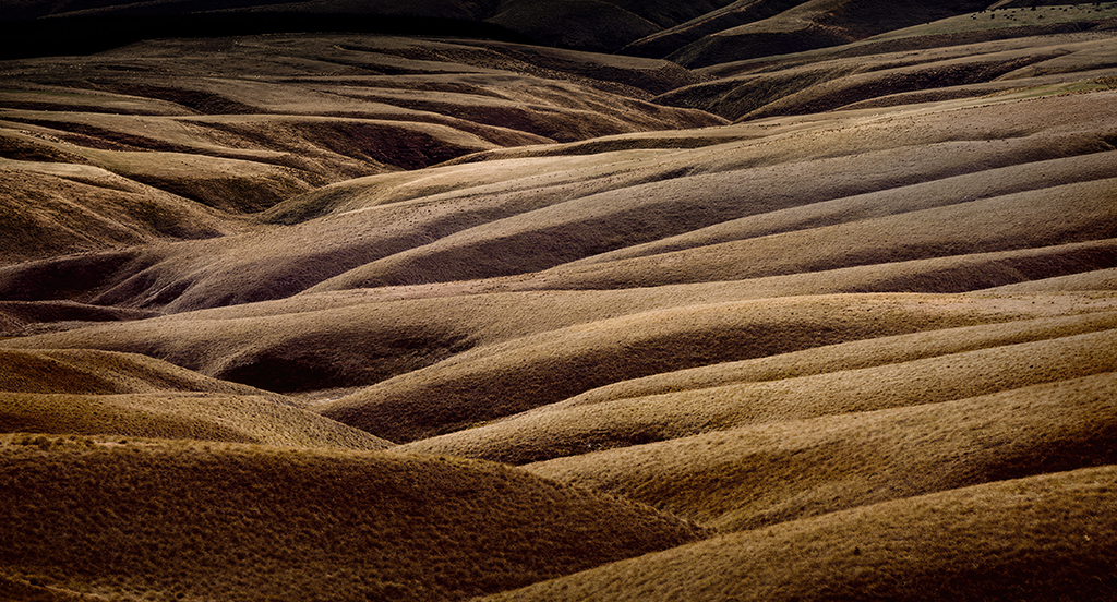 This is an amazing scene, and your framing and post-processing create a wonderful image! The rolling hills give me a sense of motion that has quite an impact. And I completely agree with your color choice. Somehow the gold feels more intriguing than the green in the original.