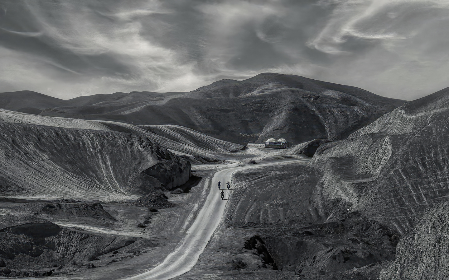 To be a bit different, I decided to take the lighting in a new direction. Since the riders appear to be the center of interest, I wanted to make them even more apparent. It wouldn't have looked natural to brighten the people and their motorcycles, so instead I brightened the road and left the riders dark. Another component of the wonderful photograph is the domes. To draw a bit of attention to them, I attempted to slightly brighten the building that's just in front of them.