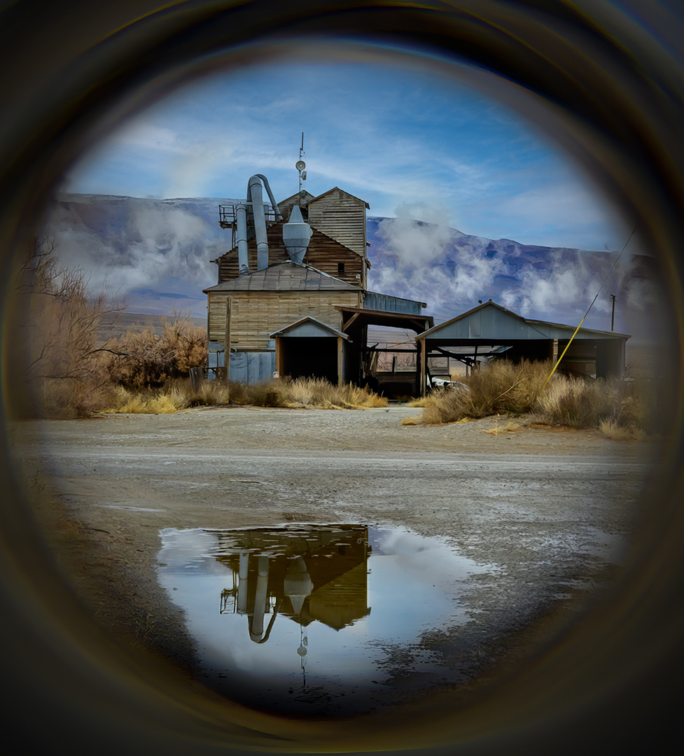I love your creativity! It's so much better to have something unique that isn't "just" a wonderful image of a building and its reflection. The idea of using the filter is great... it provides a sense of intimacy to the photograph. I think, however, that the circle surrounding the image of the old factory is too prominent. Its size and brightness pull my eyes from the really interesting portion of the photograph. Also, I thought that a different sky might be a good addition.
