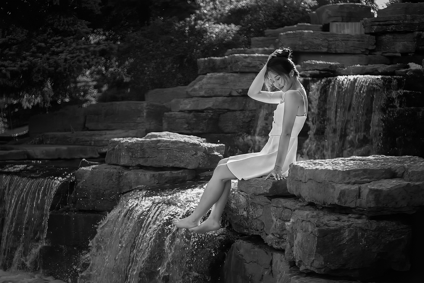 Mandy, it's a beautiful photograph of a beautiful woman. I love how the rocks in the background make a diagonal that emphasizes the woman's pose. Also, the falling water at her feet is almost a continuation of her body. Well done!