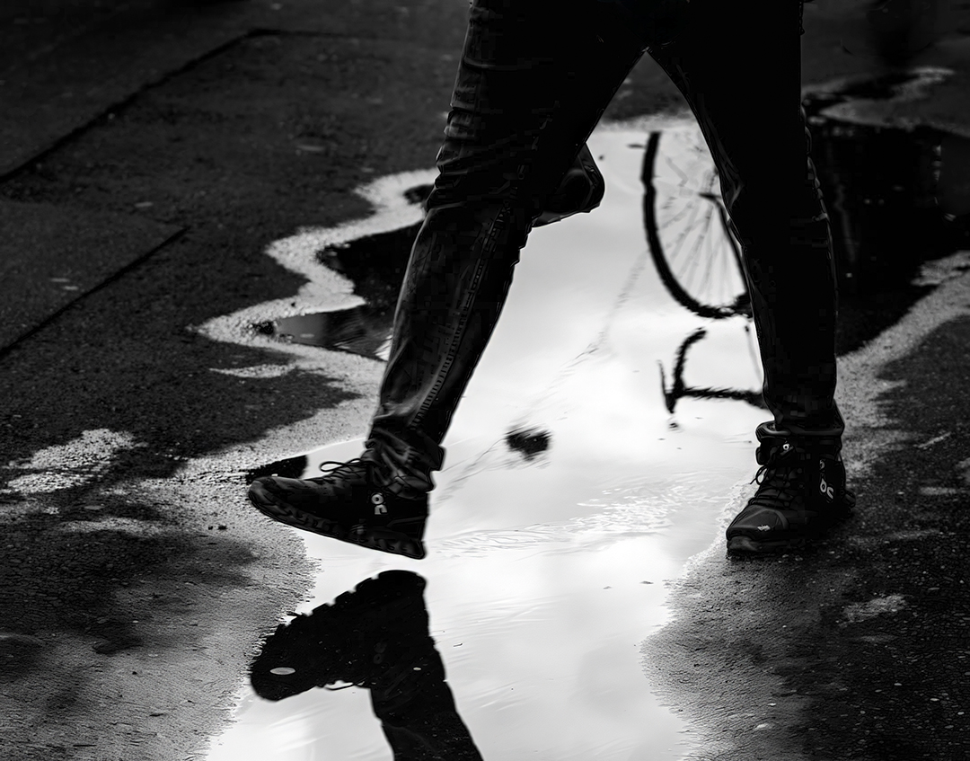 Adrian, this image fascinates me. As Emil pointed out, the composition is outstanding, though I think cropping some at the bottom would be interesting. I also agree with him that the hand pulls my eye out of the frame. After thinking about it, I decided that the point of focus that works best for me is the heel of the foot that's about to touch the water. With that in mind, I took your image into PS and ACR to play a bit. One of the things that I did to bring focus to the leading leg, and hence the foot, was to bring a tiny bit of detail into the jeans. I'm not sure I like how it now looks, however, here's what I came up with.