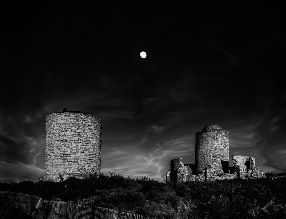 Michael, this is outstanding and definitely reminiscent of Ansel Adams' works. The lack of foreground space doesn't bother me in the least. The one thing that might have been nice (if possible) would be to have a camera position that would make the two structures a bit closer together. However, there is relatively wide separation, which is mitigated by the presence of the moon, so it's not a significant problem.