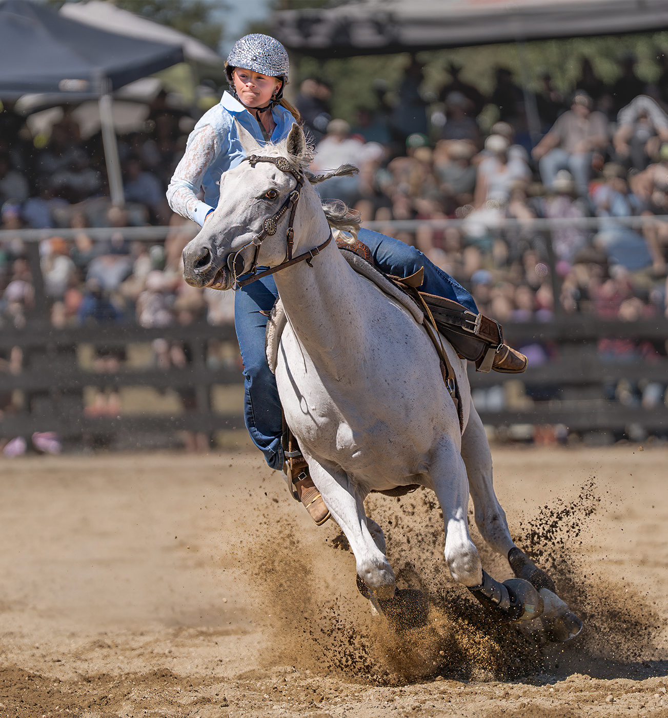 Great capture, Mark. Your timing and position were perfect! I like your approach to the post-processing. Deemphasizing the background is an excellent way to focus attention on the horse and rider. I played with your image in Camera Raw to further reduce the background. I also slightly brightened the dark area of the rider's face.