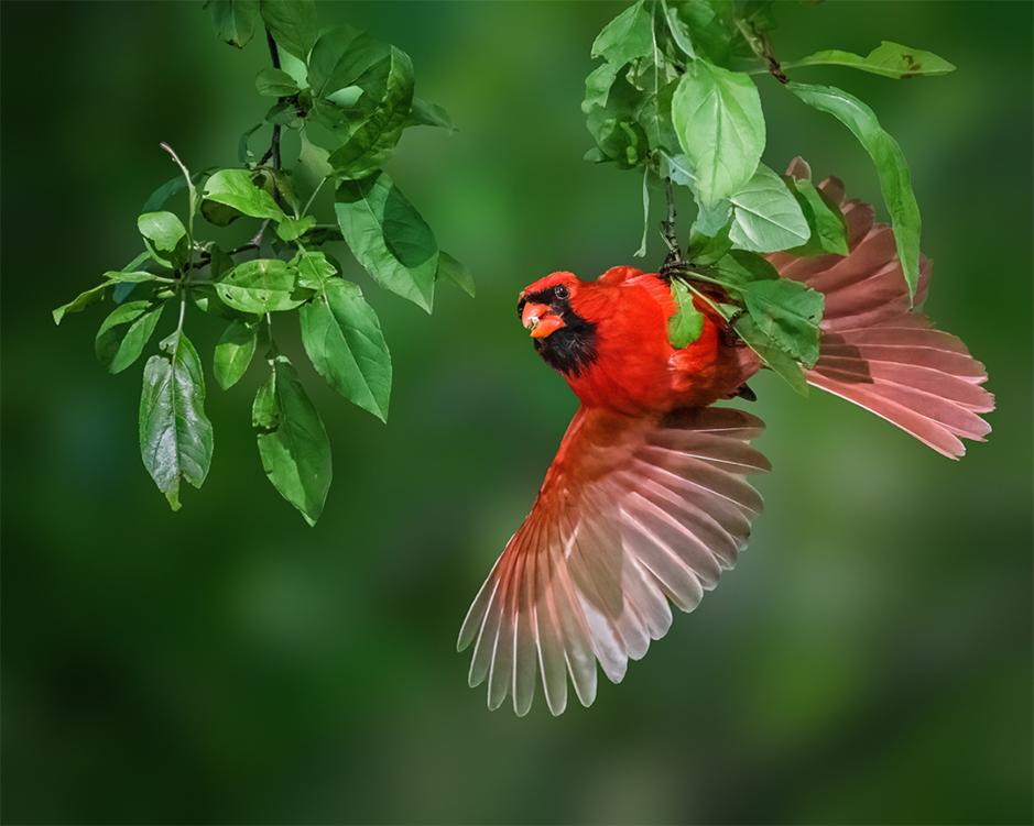 There are two tiny modifications you might consider. First is Mark's observation about the bright leaf. Second, the leaf touching the bird's head is a bit distracting. I tried showing how it would look if these two items were addressed.