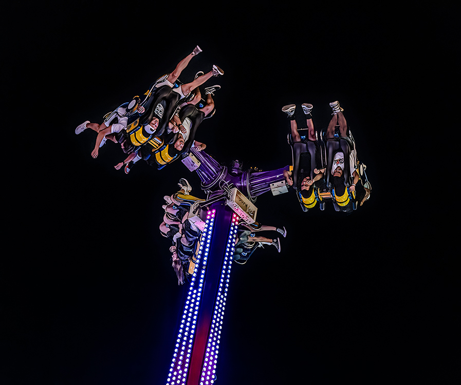 This was a tricky shot to capture. The dark night and the bright lights on the ride's arm stretched my camera's dynamic range. This was further complicated by the motion (FAST) of the ride. |