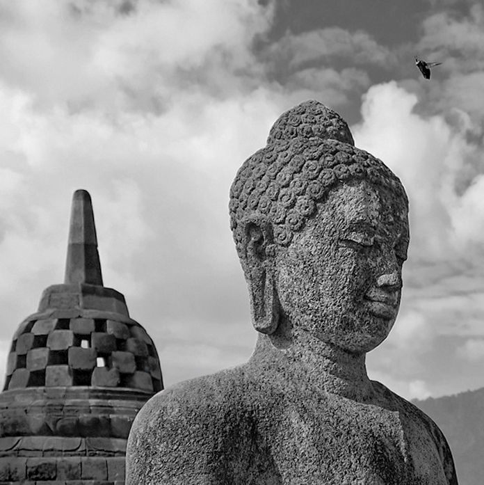 Kamal, your wonderful image is certainly getting lots of attention and excellent comments/suggestions. After looking through the many variations, I decided that Adrian's appealed to me since you intentionally included the insect. So, starting with Adrian's variation, I slightly modified the photograph by removing a few items I found distracting, straightening the temple tower on the left, and lightening the dark area of the Buddha. Your thoughts? |