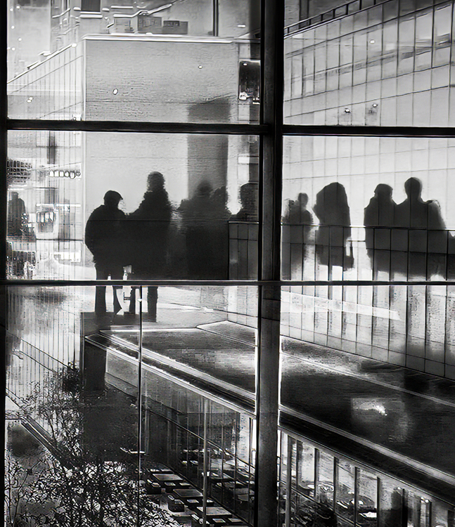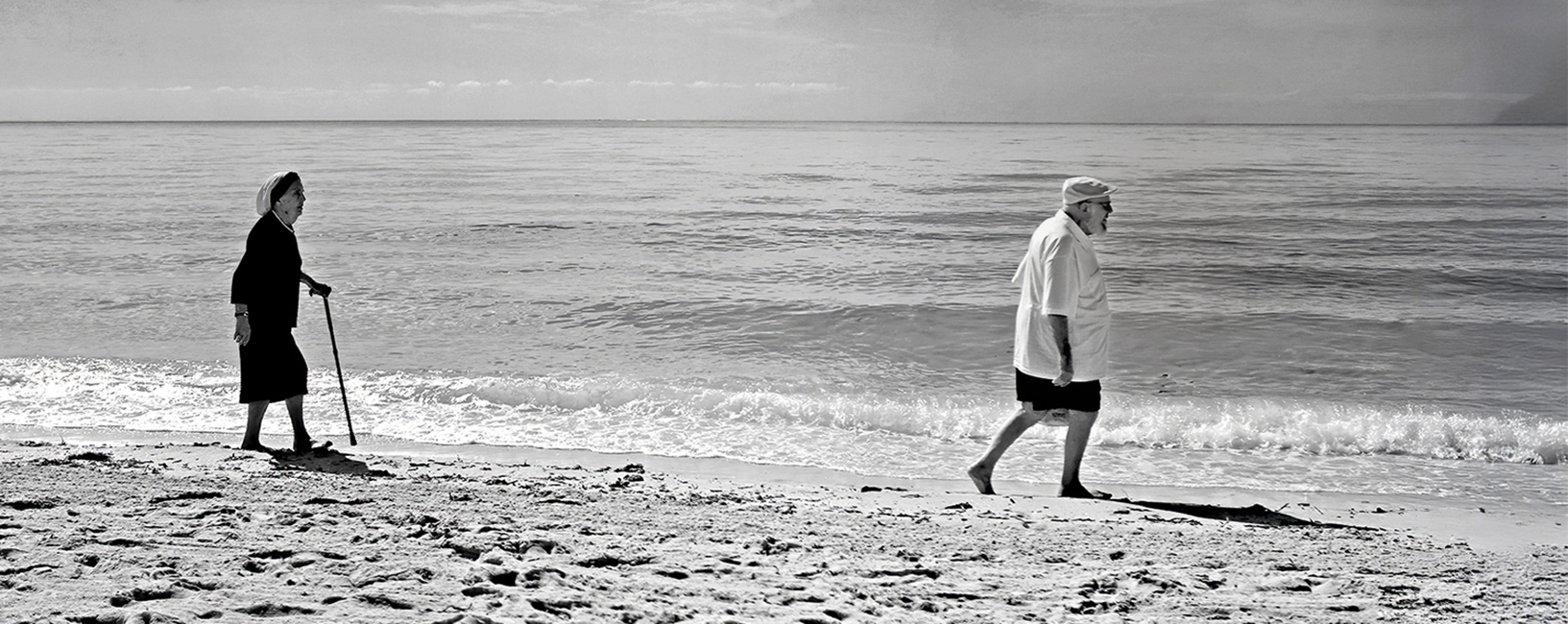 Mike, to me, your image tells an intriguing story. I see it as the woman walking with her cane, trying to keep up with the man who is forging ahead. Hence, my version would be titled, "Separated". To further emphasize this, I turned it into a pano. I know it's not what you felt when you saw the couple, but it was fun altering it.