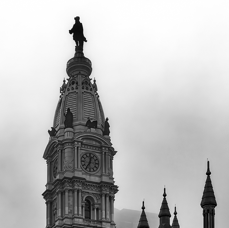 Wonderful architecture, Ed. I am fascinated by the four dark figures sitting on the ledge below Ben. With that in mind, I wanted to create a new image to emphasize them. I cropped heavily and did what I could to cut through the fog. It's not an improvement on your photograph, rather something different.
