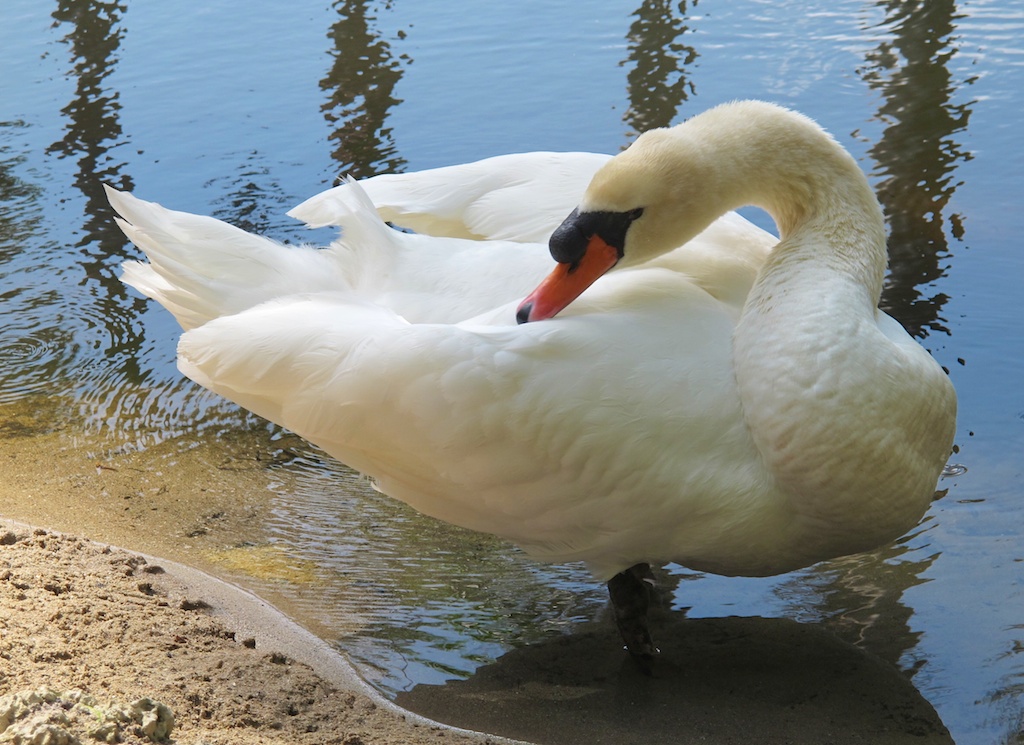 I like this capture of the ship with the seagulls on one side and the sun on the other, the details of the rigging and the individuals on board and boarding, plus the ripples on the water accented by the green foliage.
