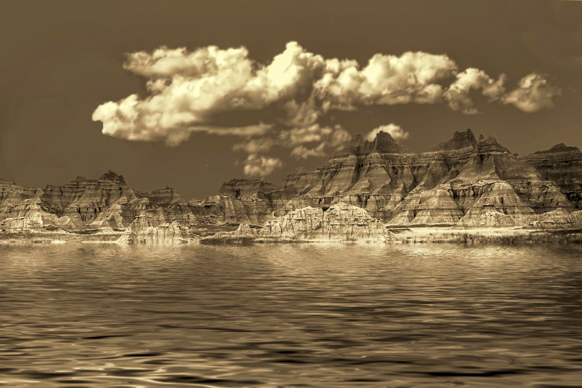 I like the composition. The addition of the sky and water seems very natural with the rocks and clouds both highlighted with sun from the same direction. To me adding the moon does not seem to go with the design and flow of the rest of the photo. I like the sepia tone but felt a little more contrast was needed. In my revision I increased the contrast and eliminated the white spot in the top right corner of the photo and the moon. |