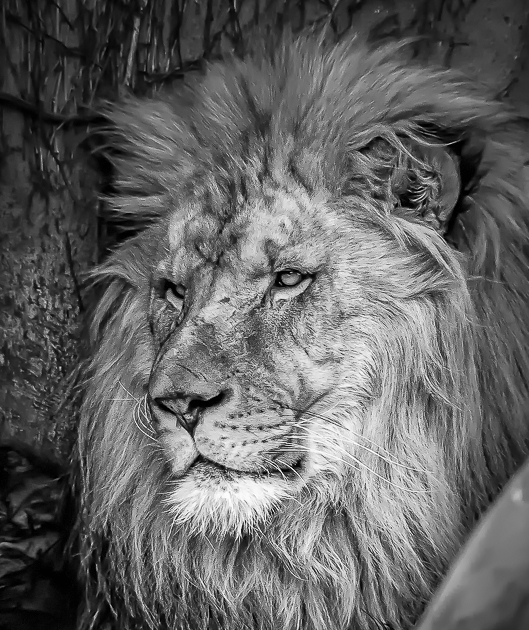 I like the composition and the lion's gaze and I like the mono version more than the color photo. But I don't like whatever it is in the bottom right corner of the photos and along the bottom edge. And, to me, I think you pushed the contrast too high - so much so that the face is overexposed and the shadows underexposed. In my revision I cropped out much of that object in the bottom corner and reduced the contrast. My photo could be further improved by blurring some of the background. |